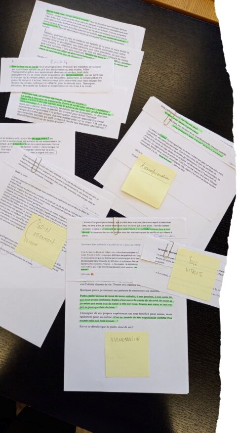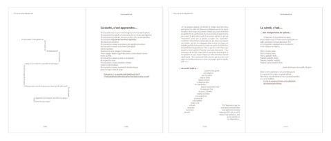 Après avoir clarifié les rôles de chacun·e et choisi le thème "La santé, c'est...", chaque auteur·ice a écrit 2 à 3 fragments de 100 mots qui s'ancrent dans des expériences individuelles (écriture en "je"). L'objectif était de proposer une définition collective de la notion de santé et d'expérimenter des formes d'écriture qui suivent d'autres chemins que ceux tracés par les canons conventionnels. S'en sont suivis un feed-back collectif sur les premières versions reçues, une mise en commun sur Framapad, un travail sur l'agencement et la mise en forme, pour finir avec une ultime révision collective.