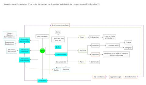 L'équipe de recherche a produit une modélisation de ce en quoi consiste l'orientation en santé. Cette modélisation a été présentée et discutée dans le cadre de la 2ème rencontre du Laboratoire citoyen en mars 2023. Les discussions et débats ont mené à l'énonciation d'un constat: "si je veux être en mesure de m'orienter au plus près de mes besoins et de ce qui importe pour moi, je dois savoir où je me situe aujourd'hui". Dès lors, la focale s'est resserrée autour de la question: "comment exprimer ma situation de vie actuelle et la transmettre de manière claire au professionnel·le de santé à qui j'ai affaire, pour me sentir vraiment acteur·ice de ma trajectoire de santé?"