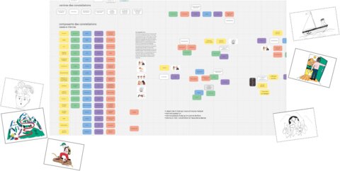 Un groupe de travail restreint composé de designers, chercheur·ses et membres du Laboratoire citoyen s'est réuni à plusieurs reprises durant l'automne 2023 pour travailler sur la conception d'un prototype de l'outil, sous la forme d'un jeu de cartes, qui sera présenté au Laboratoire citoyen suivant prévu quelques mois plus tard. C'est à ce moment-là que la logique des "portes d'entrées" et des catégories de mots, pensée pour faciliter l'expression d'une situation, a été imaginée.